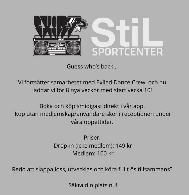 Erbjudande om 7 dagars prova-på kan inte komb. med andra erbjudanden & inkluderar ej entré på badhusen. Kan endast aktiveras aktuellt datum och om du inte varit medlem på StiL senaste 24 mån.